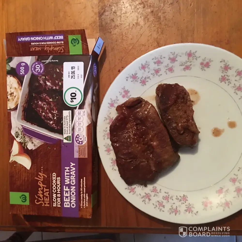 Looking forward to the slow cooked beef with onion gravy $10 but what I got was absolutely pathetic shame on you Woolworths .what I got was two pathetic little pieces of meat and bag full of watery so called gravy judging by the size of the box thought would get a lot more this would only feed one child very disappointing.