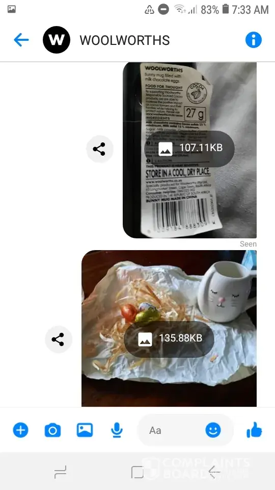 I bought my grandchild this mug from Woolworths for Easter. The label states that the mug is filled with Milk Chocolate eggs. The mug was filled with paper and strips of plastic. The only eggs were the 3 which were visible on the top. This is absolutely shocking. My grandchild eagerly removed the top 3 and then her face changed as she pulled out more paper and more plastic without another single egg. This mug was NOT filled with Milk Chocolate eggs!
