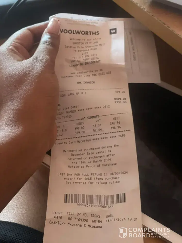 On the 17th of January, I went to Woolworths in Sandton to purchase shoes for my daughter. My daughter wore them on the first day (the 18th).
