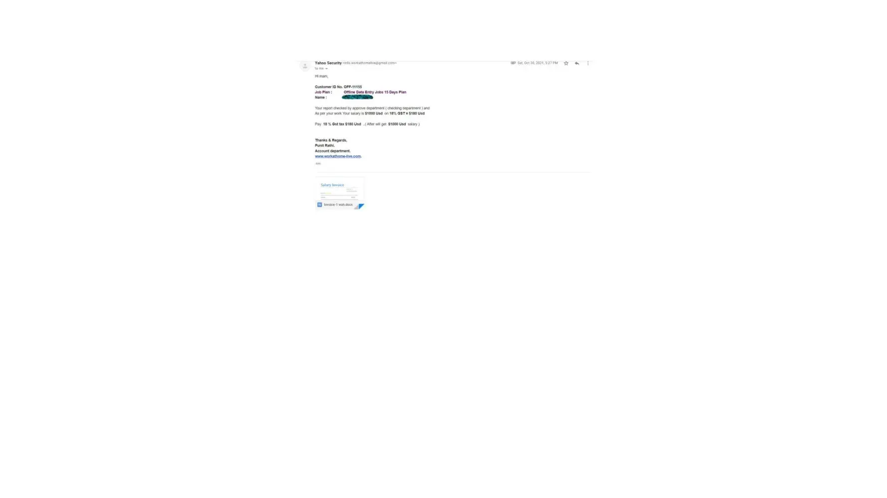 After sending my payment via Western Union, I followed them up about the payment and requested them if they can already send my salary. After several days, they informed me that there is a problem with the processing of my salary and I need to pay again the amount of $230. This is for the one-time fee so that my salary will process within 3 days and I will no longer wait. Because of this, I told them that I am no longer interested to continue working with them because they keep on asking for money. I told them that the reason I applied to work is to have an extra income, but instead, I was the one who is sending money to them. Then I demanded Kahal Rawat to return all the money I paid to them. After that, they no longer replied to my emails. I keep following up on my emails but there's no response from them. The person I communicate with via email is Kajal Rawat and the person who is receiving the money from Western Union is Aub Mirza.
