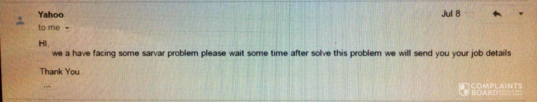 I paid registration fees Rs. 2500 for Online form Filling on July 5, sent the screenshot to the site the same day. They acknowledged it on the same day and said we will contact you shortly with work details. I waited for two days but they did not respond. So I wrote to them to give the work details. On July 8 they wrote back there is a server problem. Again some days passed but they did not respond at all. Finally I wrote to them again. They replied on July 21 that they will sent the work details on July 22 but did not sent it. I phoned them; a man picked up the phone and said he is busy in a meeting or something like that. I have phoned on some other days too but their phone keeps on ringing nobody picks it up. Is this the kind of support that a genuine site give to its members? As this is a long distance call I can’t even properly hear what he is speaking that is the reason why each time I speak to him I ask him to check the e-mail that I sent to them. But they are not even willing to do that. Before getting money they were very keen on answering every query that I made in relation to Online Form Filling. But after they received the money, they don’t even check the mails that I have sent them. Now that it is almost one month I know they make false promises and false claims and is not ready to give work as their only intention was to get money. The reason why I am writing this is because I do not wish anyone’s hard earned money to go to such scam site.