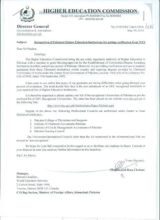 I'm from Pakistan and WES has not included some highly recommended institutions in their list. Because of this many students are not able to get their degress evaluated from WES. Concerned body of my country has requested them several times in writing but still no response. We call them and they don't respond. Because of this we are not able to get addmission in US institutions. It is ruining our future. I'm attaching a letter which was sent to WES but still no response.