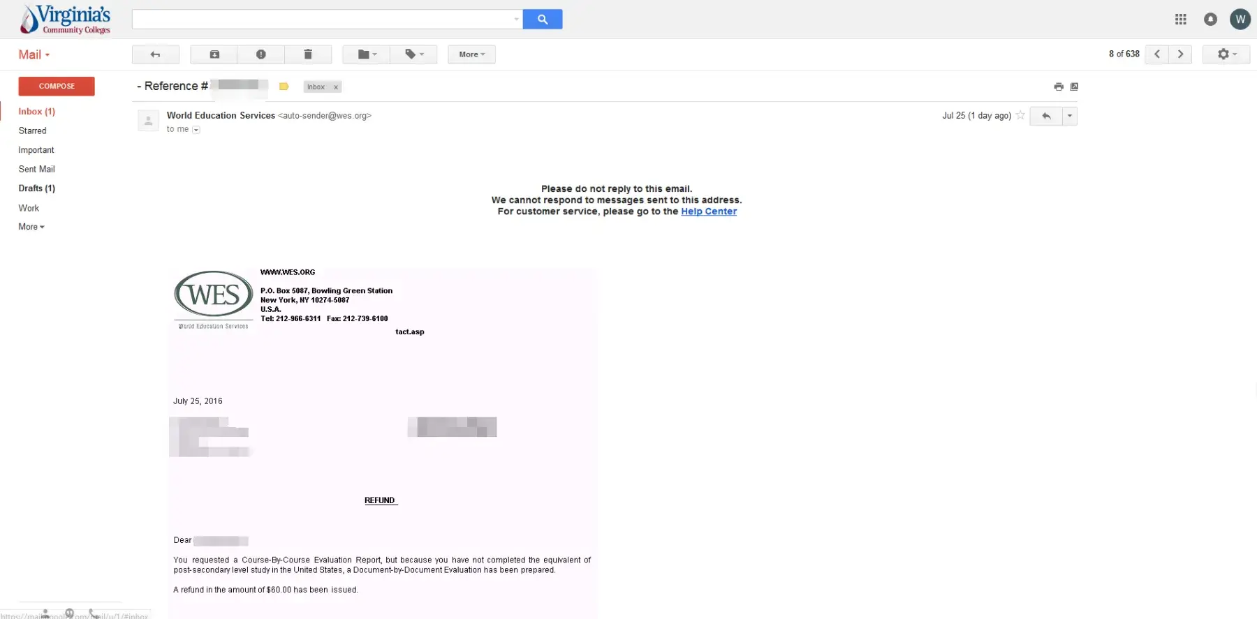 As all the complaints above WES will not reply to emails or phones. I had to plan to enroll myself in MS this sept 2016. That does not seem to fulfill. What a company, sad part they are sitting on my $254/- and did nothing. Anyone knows the best way to contact them or its a virtual company with robots/dummies working. One thing is for sure they do not concern about students though they take money in advance.