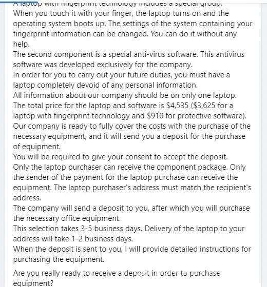 I got the same job offer. Mr. Hein sent me an e-check and said I had to print it out and deposit it into my bank account. I knew something was off. I wanted more info though. I emailed Mr. Hein and said that my bank refused the check because it was invalid. He said that he had proof that it will clear and tried getting me to deposit the check. I continued on that my bank refused. He then said that he will add me to the payroll and direct deposit the money for this specific laptop that he wanted me to buy. He first claimed that all we needed was a laptop with fingerprint access. Which I have. I have a MacBook Pro with fingerprint access but he said that my laptop won't work with their software. Thank god I listened to my gut feeling. Beware of this scam. If it's too good to be true, it usually is.