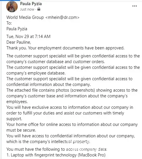 I was "hired" by a recruiting agent from world media group who called himself Michael Hein. His email is [protected]@dr.com. He said that I needed a fingerprint accessed laptop which I had one (MacBook Pro) he claimed that the companies software isnt compatible with Mac and that I needed a specific gaming computer. That was the first red flag. Then he said that I'll receive a direct deposit for the laptop plus the software and 800 wages for myself. THAT WAS A HUGE RED FLAG! Why would you pay me for work I hadn't done yet? Then he emailed a e-check and said I had to print it out and deposit it into my account. At this time I started asking alot of questions that obviously made him angry cause he emailed me back and said that if I didnt trust him and thought he was scamming then I should look for employment elsewhere. At this point, I knew it was a scam but I wanted proof it was a scam. I decided to call my banks fraud department and let them know what happened. I then deposited the check for my bank to verify. My bank contacted me and said that they couldn't verify the check meaning that the check was fake. Thats when I found the complaints from other victims. I get dozens of emails and text messages a week for job offers that are scams. After responding to them they always want to send me a check. No legit job will ask you for money or send you a check. If office equipment is required, they will send you the equipment or they will inform you beforehand what is required for the position (laptop, microphone, camera, high speed internet).