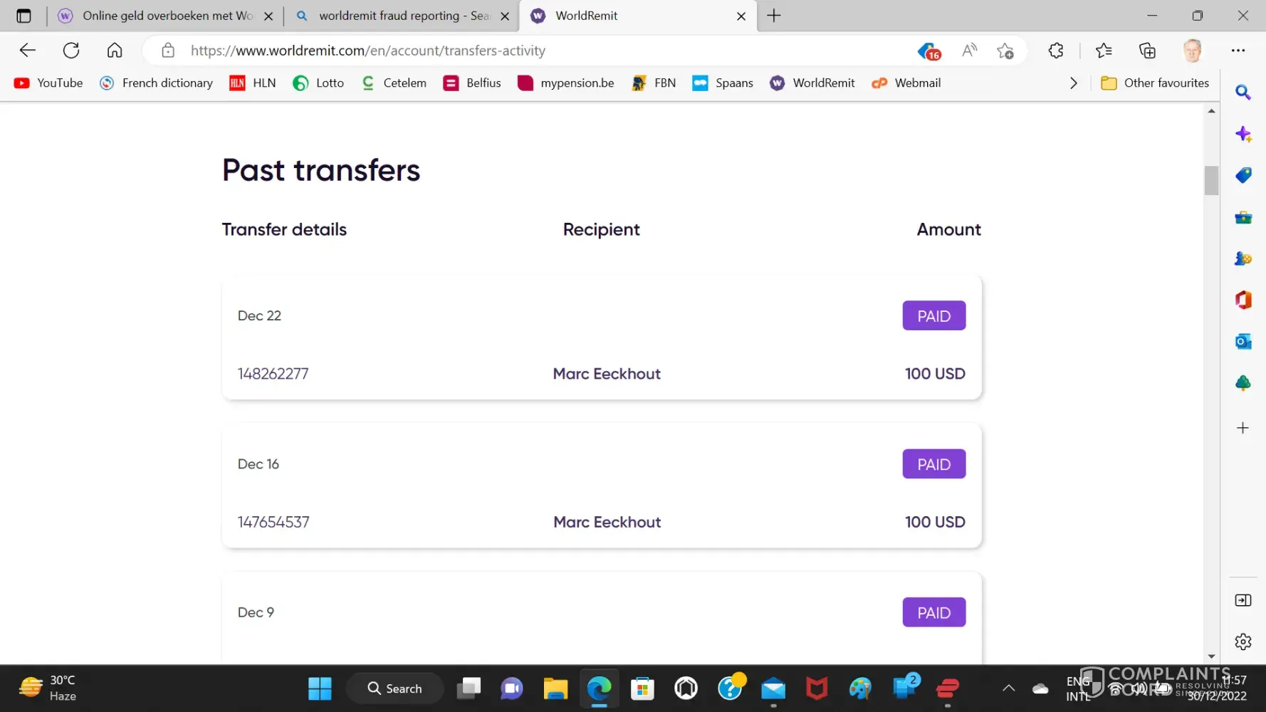 On 28/12/2022 three fraudulent transactions of +-97 Euro were issued by Worldremit as European Automatic Debits, never initiated by me, in favour