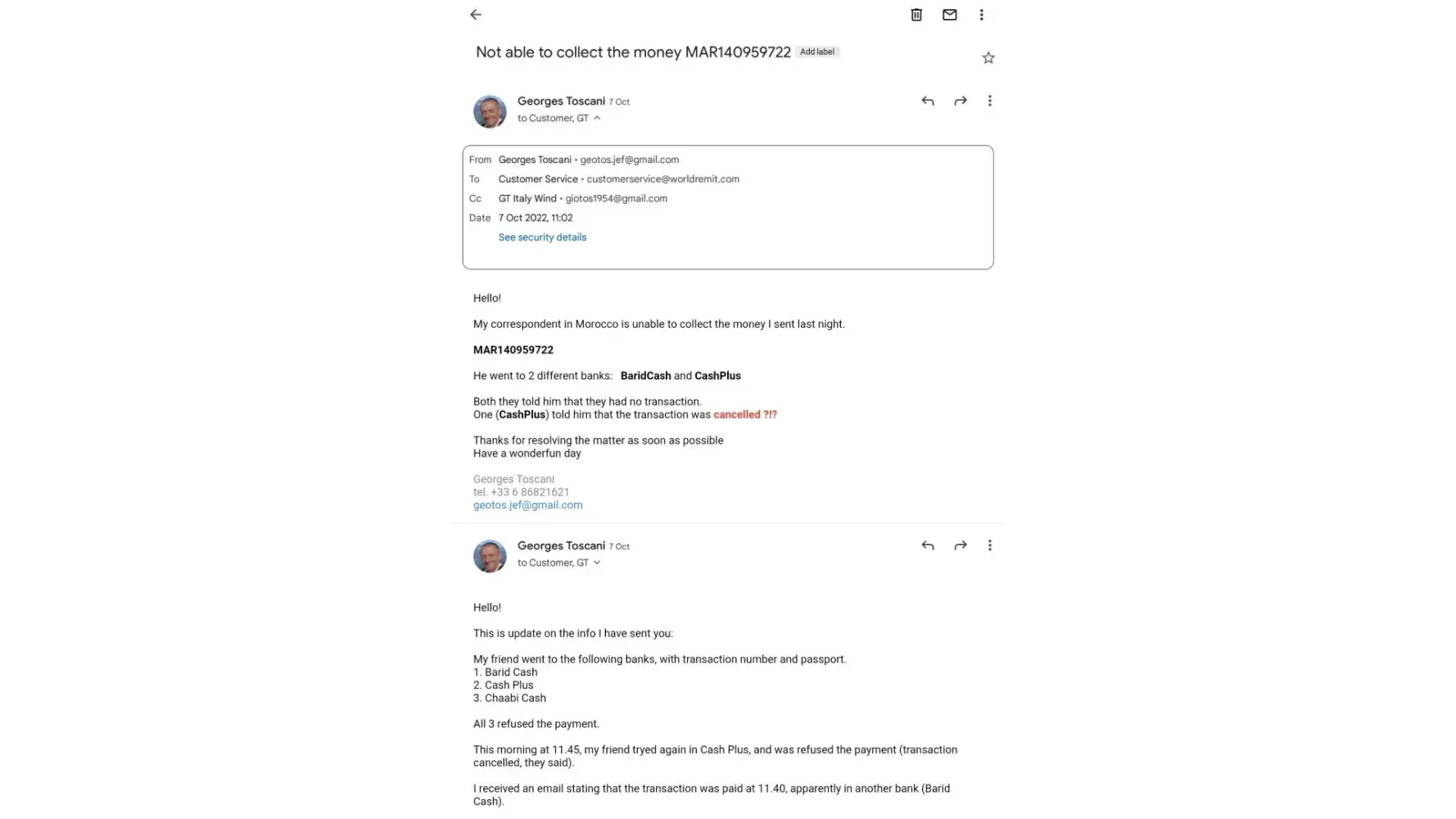 I made a money transfer on the evening of 07.11/22. There was a problem with the transfer and you said to contact you. How is it possible to contact you when one of your phones is registering as an Invalid Number and the other simply rings out then goes dead
