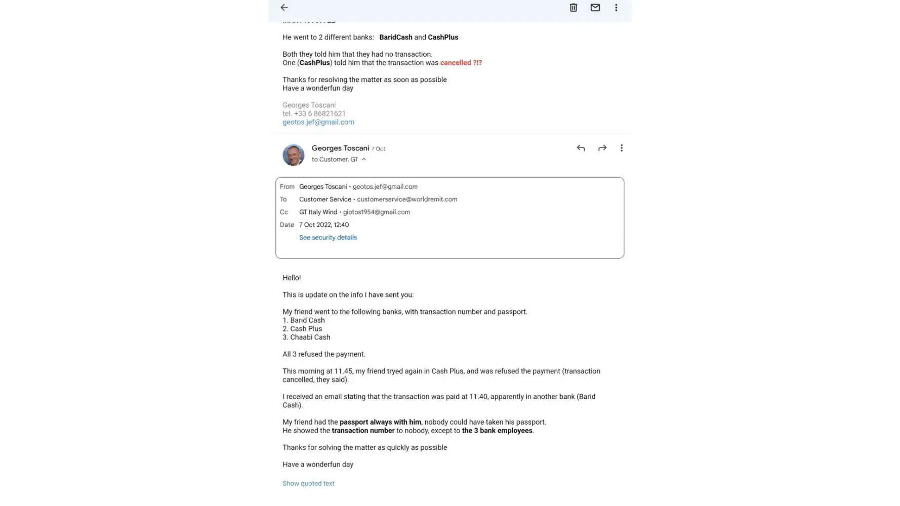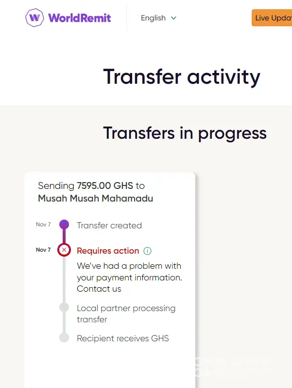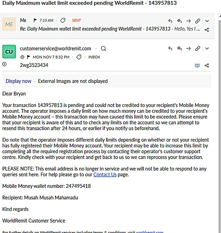 My probably has been solved. All in all, I have been using World Remit for many years, and this has never happened before. I will continue to use and trust them in the future, as long as this doesn't happened again.