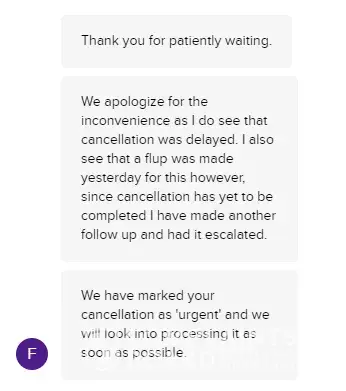 Lesley (7/8/2021, 7:52:09 PM): I've been told it can't be cancelled until your engineers resolve the problem, but that is not good enough and I am being told this day after day.