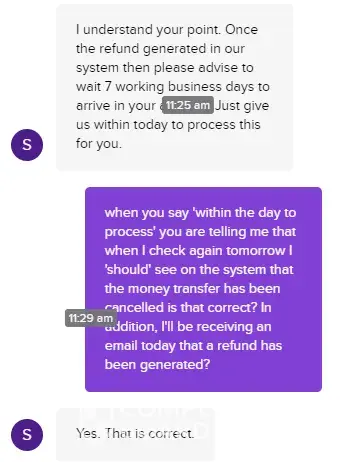 WorldRemit Agent Michael Diofre (7/8/2021, 7:48:08 PM): Sorry to hear about that. I understand that you want your transfer to be cancelled..
