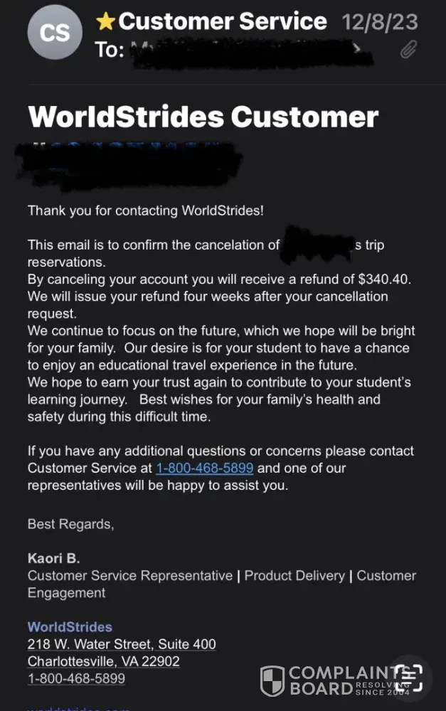 I feel that I have been taken advantage of by world strides. My daughter auditioned and was accepted to the Sydney Australia performance. Unfortunately, we had to cancel because her father nor I could provide the funds for the program. I wrote World Strides and Honors Performance Series because they said that I needed to cancel in writing. According to the documents I signed, I would receive 50% of the program tuition back if I cancel before December 30, 2022.