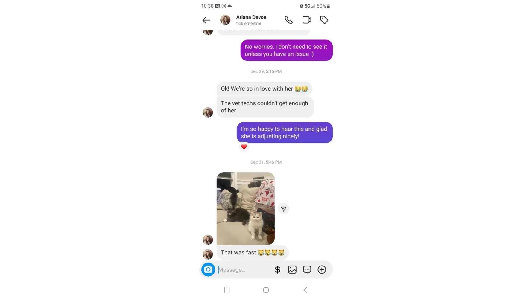 You are actually insane. If you had an issue, you'd come to me. Funny you have time to send a multitude of pics and texts about how great the kitten is, but now say you had no time to say she was sick. Right 🤣 I have not seen any type of documents other than you saying kitten had no issues for WEEKS after leaving. Funny if she was sick at arrival how you'd introduce her immediately to your own cats. That doesn't add up. I'm done replying to an insane person, and FYI, nothing posted on this [censored] board, that does nothing to verify the claims are actually true, can be redacted. If you post my personal info, its called doxing, and that you can actually be a criminal complaint. A user name is not personal information.