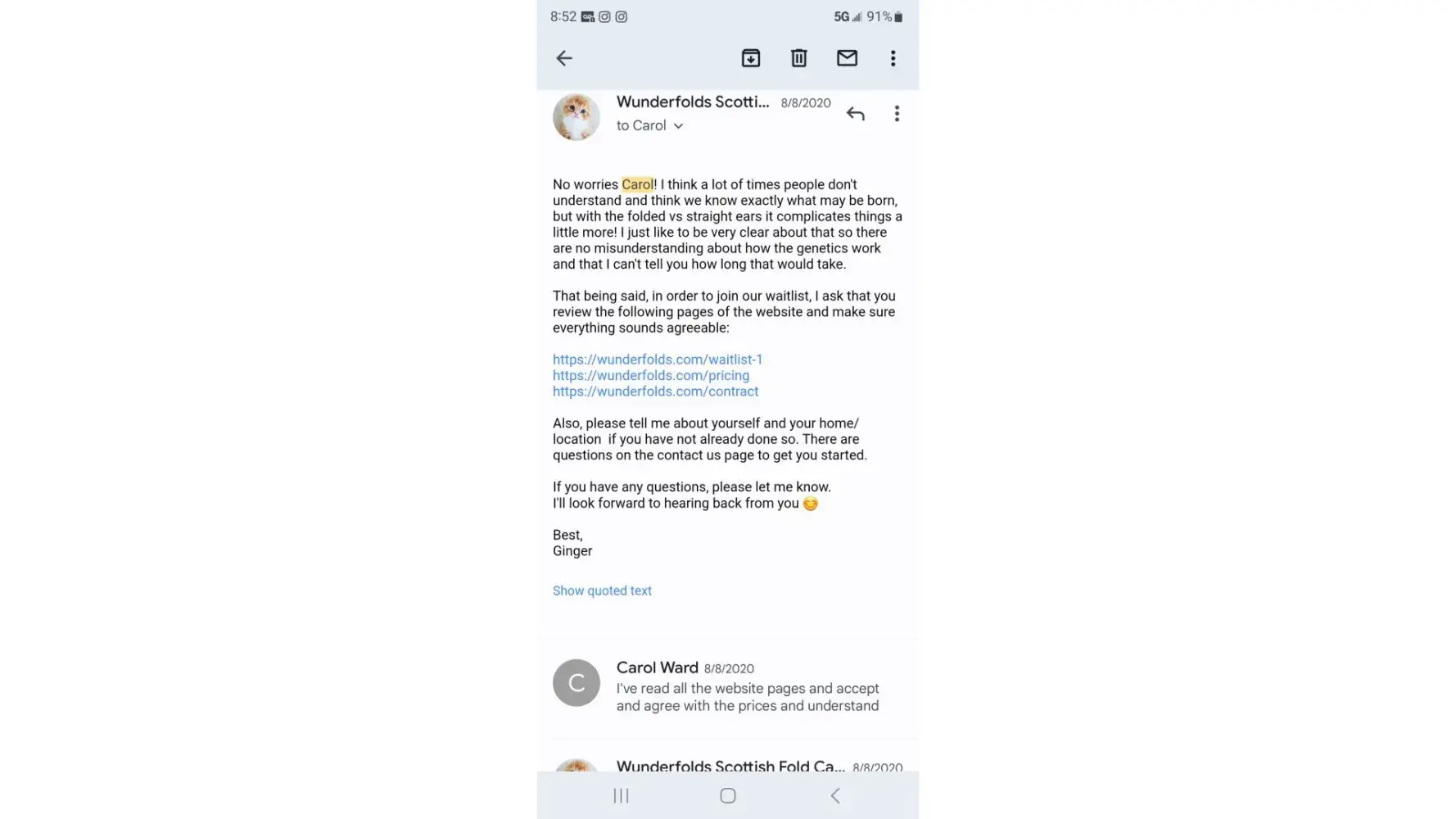 I spoke with 'Ginger' who breeds at Wunderfolds Cattery more than one year ago and send her a deposit of $250, she said if after one year I did not find the kitted I wanted I would get a refund.
