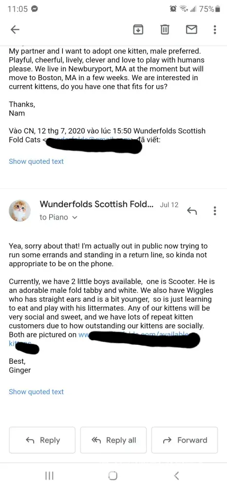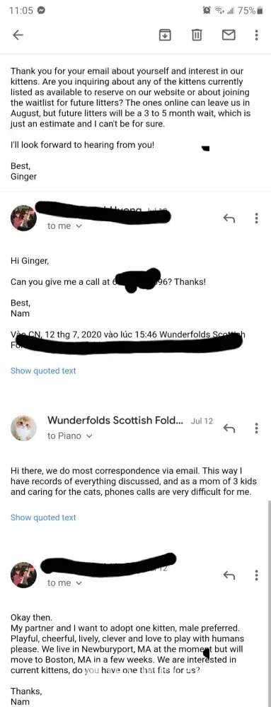 Also nam... provided ss of our communication. I never once pushed you for money and had you expressed interest in either of the boys I had available and wanted me to call you at that point if it made you feel more comfortable, I would have. I don't return calls for people if I do not know they are 100% interested or i'd have no time in my day for everything else I have to do. you never replied back with interest in those kittens, and i'm not hard pressed to place my kittens, so I am not going to chase you down... like someone scamming you would. i'll also note, this is 100% proof of why I keep most correspondence via email so that if someone wants to say falsehoods as the complaint above, I have my proof. you cannot do that with a phone call.