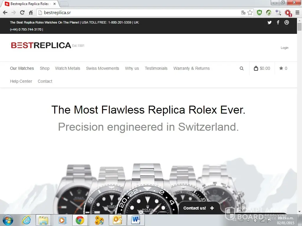 Never buy a replica watch on this web pages. (www.bestreplica.sr/www.swisstime.sr).I order my watch on 31 december 2014 (order # [protected]) and after almost tree months I am still waiting to refund me the money.At first they answered my emails where I had some questions regarding the delivery. BUT, when I bought and paid for the watch the amount of US $ 1, 350 simply disappeared, not answered my emails and multiple phone calls (always answered by an answering machine)I sent them several emails asking them refund my money and if they do not reimbursed my money I told them to send me the watch bought .The charge to my credit card was made from Garborone, Botswana, Africa to a company called: LEGAL ATTORNEY SERVICE SWISS GRADE ONE.Be careful with purchases of replica watches and especially with this websites. There are not honest and no dignity.His name is Tom.I warn you in advanced that website and this person are true scammer. Be aware!