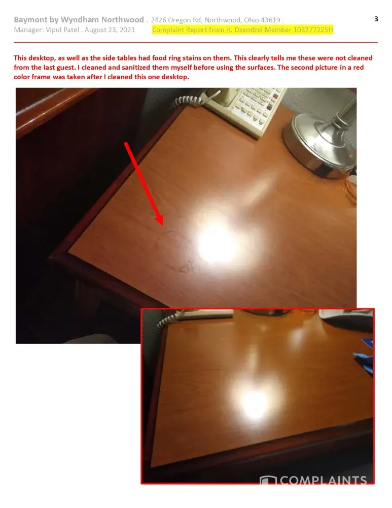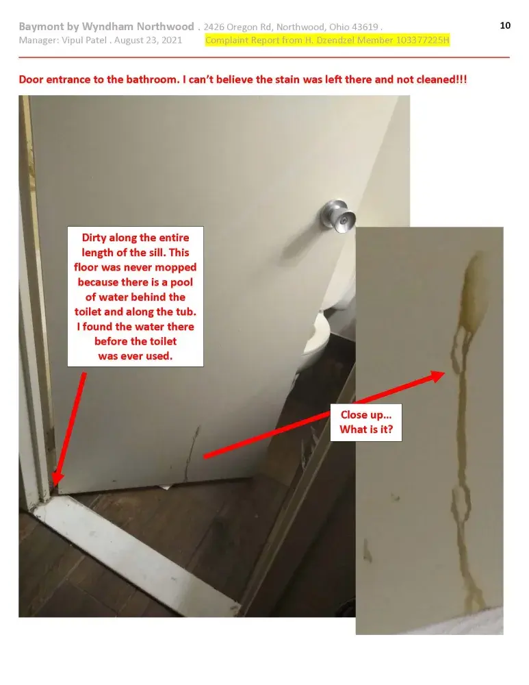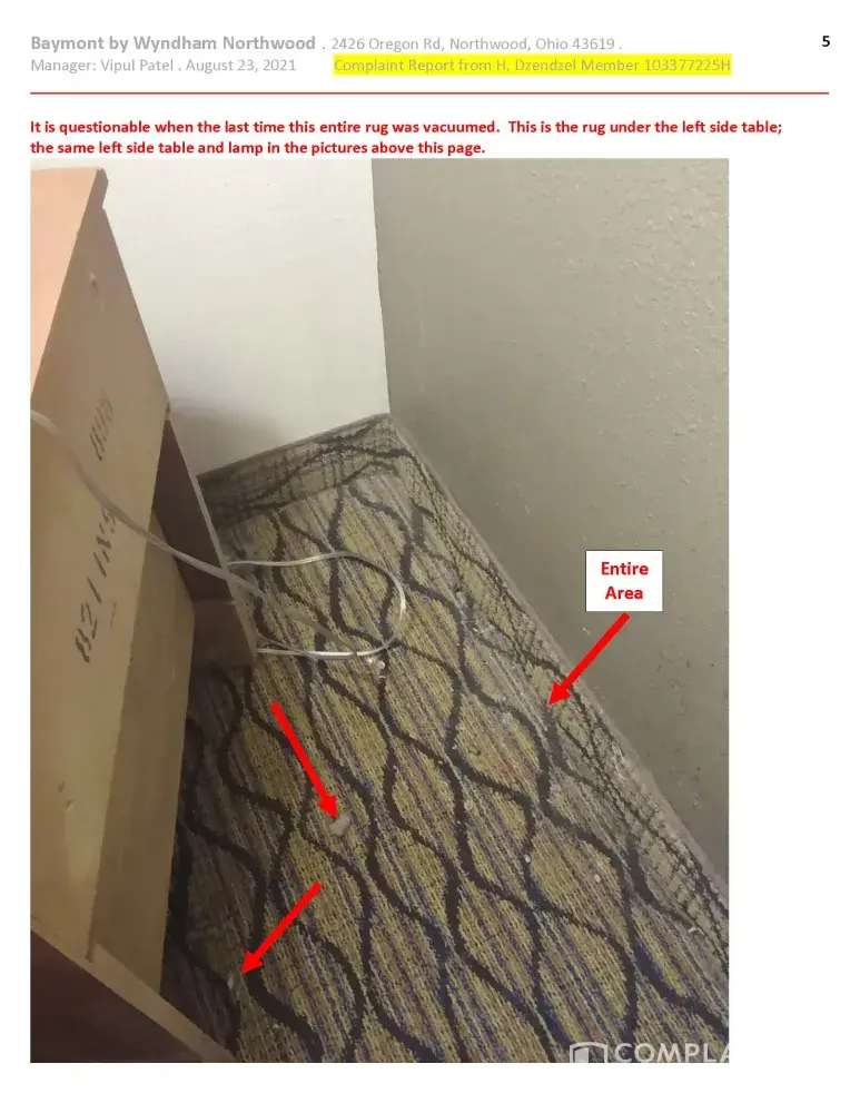 I did stay overnight (see paid receipt attached) for the following reasons: (1) it was late in the evening and we were exhausted, (2) I knew it was for one night, (3) after inspection, the sheets and the bathroom sink counter were clean, and (4) the free breakfast. I am not seeking the $45.49 cash, however I am asking for the 3, 000 points to be returned back into my account. Below, see the pictures I took of the room that night; and their explanations. (If the 15 pictures do not appear, please contact me to resend them to a different address.