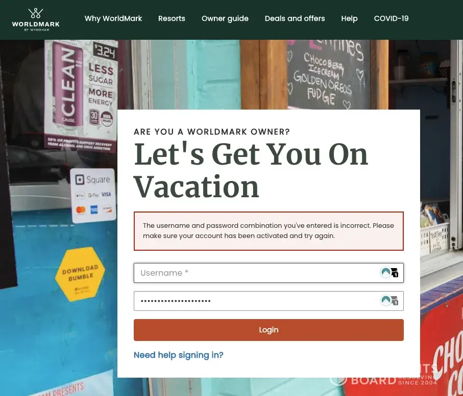www.worldmarktheclub.com has been discontinued. The new website is: https://worldmark.wyndhamdestinations.com