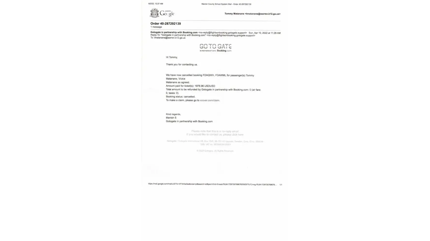 Purchased XCover.com Travel Insurance ($127.01), through Booking.com, (12 Mar 2022) to cover two round trip flight tickets (to Key West, 1 Apr -8 Apr 2022. We had to cancel the flight reservations 1 April 2022 due to an error in port of departure & return. We assumed that Augusta (AUG) was Augusta, Ga (AGS), when we made the reservations, and when we arrived at the Airport we were told that AUG was Augusta, ME and not Augusta, GA. We immediately notified Booking to cancel the reservations and decided to drive to Key West. Booking emailed us the cancelation confirmation and a link to XCover.com to submit the claim. I submited the claim with XCover and emailed this company mulitipule times, trying to get a answer or status to our claim with no response. The XCover.com website states that the claim has already be submitted and nothing else, no contact information on requesting status or information on refunds.