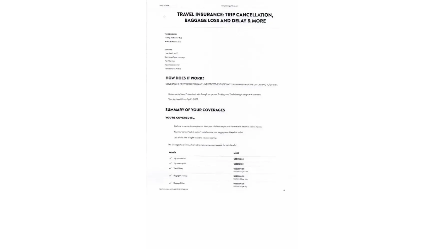 Xcover is a scam I file a claim with them because my connecting fly was late and I loss my flight back to the USA I ending paying for another flight and nobody is getting back to me. Booking is a joke too they only they your money and do not help you