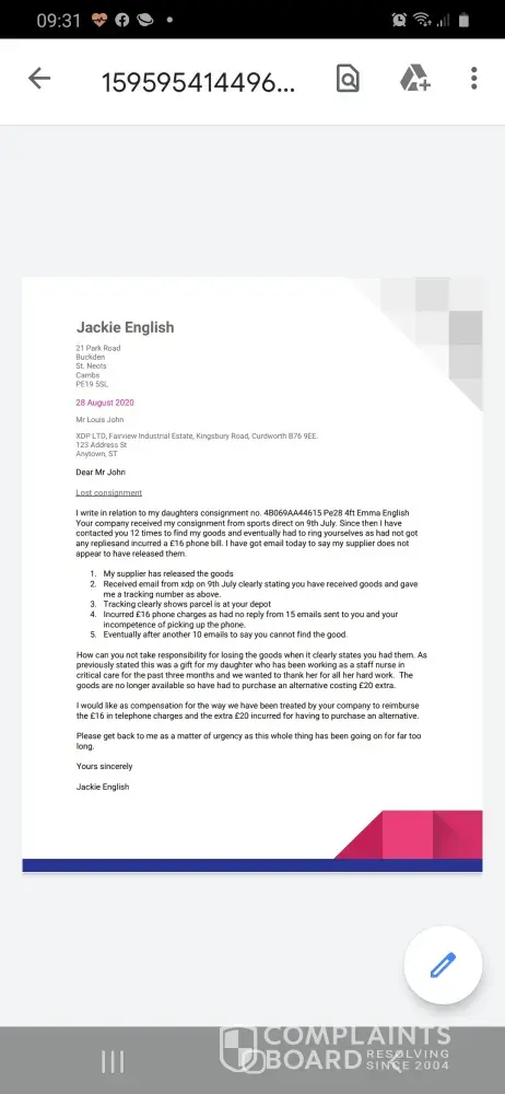 XDP Lost my consignment and won't take responsibility. I emailed them 12 times and eventually had to phone which cost me £16. After them telling me they were looking for the goods. Again another 10 emails sent to be told they cannot find my consignment and to get replacement from retailer. Retailer no longer had lounge set so refunded my monies but had to buy replacement which cost £20 more. Have asked XDP for £16 refund for telephone call and £20 for extra cost of goods as they were the ones who lost the consignment. Sent another 10 emails to complaint dept and louis john director. Also sent letter in post to louis john no response. This was a gift for my daughter who has been working in critical care for the last three months and this was a gift to say thank you for all your hard work.