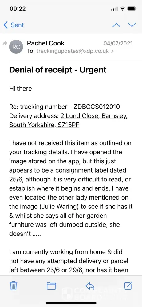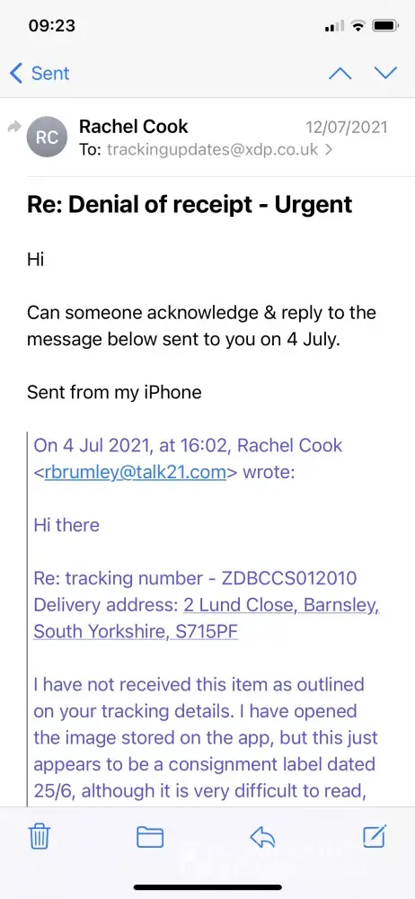 They even had the cheek to use the picture of the front door at my house taken the week previously to show in the tracking even though the photograph is time stamped and dated a week ago and it shows this on the image ! You can’t get in touch with XDP by phone easily and they don’t even answer once you get through. Live chat doesn’t work and they don’t respond to emails. I beg anyone who reads this , if your retailer says they use XDP then get them to use another courier or buy from someone who doesn’t use them.