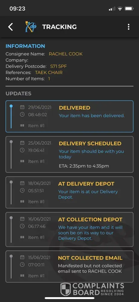 Absolutely shocking! Ordered an expensive wooden garden bench through eBay. Initially stuck at depot for a week, then updated with a delivery estimate of 25/6 2:30-4:30pm. Next update to tracking was 29/6 saying delivered at 08:48 - the delivery image is merely a bad photo of the consignment label. The worst thing is they will only deal with the account holder. The seller was responsive at first, but not getting anywhere so raised a case with eBay .. they advised to raise a "denial of receipt claim by phone or email". Well now sent emails to 3 different addresses & no replies 3 weeks later ... eBay also advised to call on [protected] & guess what they do not answer the phone at 7p per minute ... either cuts off after 10 mins or queues forever. Absolutely appalling. I am that angry that I'm going to make a small claim against them. Tracking information is clearly dodgy & either they have dishonest or just stupid drivers ...