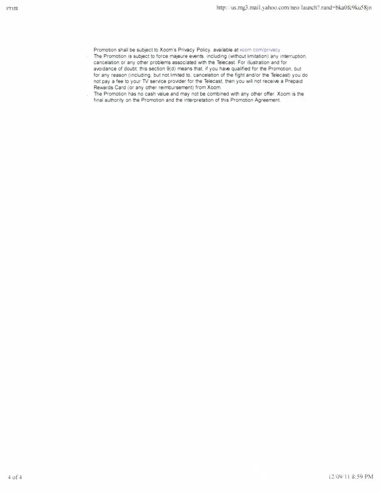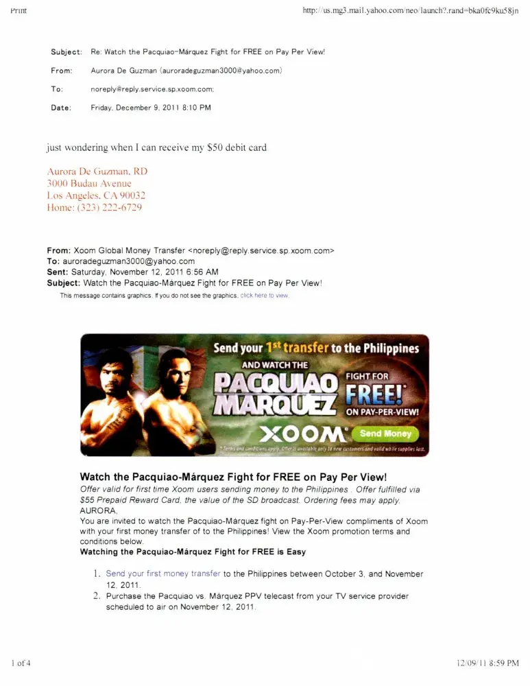 The attached website says that if we send $50 to the philippines by nov. 12, 2011, we will be able to get a $50 debit card in essence, we get the fight for free. Further it said that an email will be sent between nov. 12 thru dec. 5. We talked to two ladies (Sheila is one of them) and the supervisor is carlo and said the website is no longer active and it is unfortunate that we lost the $50. 00. This is bad advertising and should not be tolerated. They claim that the email was sent on nov. 15. We never received this email. It is the principle that counts. $50 is $50. This is very bad business. It appears that xoom is guilty of promoting the pacquiao fight just to get more customers to send money but they never deliver what they promised & misleading the public. I will file a complaint with the federal trade commission and better business bureau.