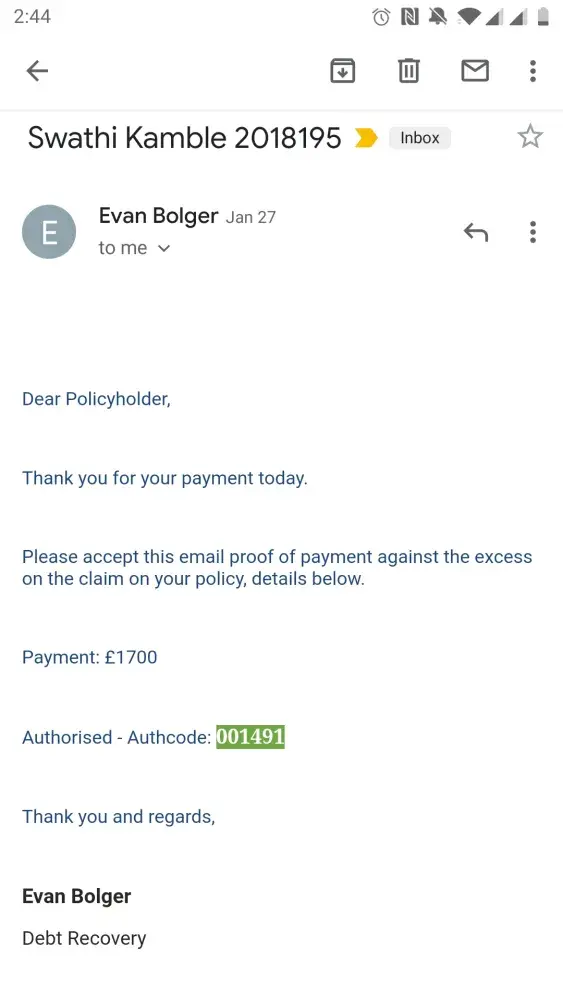 I filled out the form they sent me asking about what had happened where it was and that was all done then on the 14 feb I received a letter from xs direct saying that the third party had been settled £3756.00 and that our policy carries out all section excess £3000 so they are saying that I have to pay £2961.60 is due by the 25th feb 19.