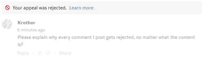Every single comment I post, Yahoo automatically rejects it. I file an appeal and it is rejected within 15 seconds. Here is my most recent.