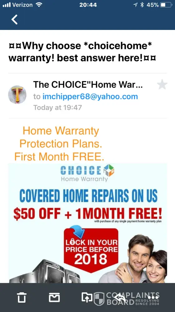 Choice home warranty's/ chwplan.com email spam shows an unsubscribe link that just loops back to its advertising not allowing you to unsubscribe. This should be illegal! If you have a link to unsubscribe it should allow you to unsubscribe! I also do not like yahoo's complaint site that says my complaint wasn't long enough and may not be investigated! Makes me want to drop my yahoo email account. Why does my complaint need to have more content? Are you protecting these spam sites? Do you feel like your customer's are the problem when they make a complaint? Is costumer service really your priority? Do I need to complain to the FCC or research what agency I need to complain to to get results since you now wasted my time making sure I had enough words in my complaint to make you take it seriously?!?! Fact is I should just drop my yahoo account because I know you don't care! Why do I have to write an essay to get you to fix a spam email?!?!? I've decided to copy this so I can paste it and resend it every day until you are as annoyed as I am about spam!