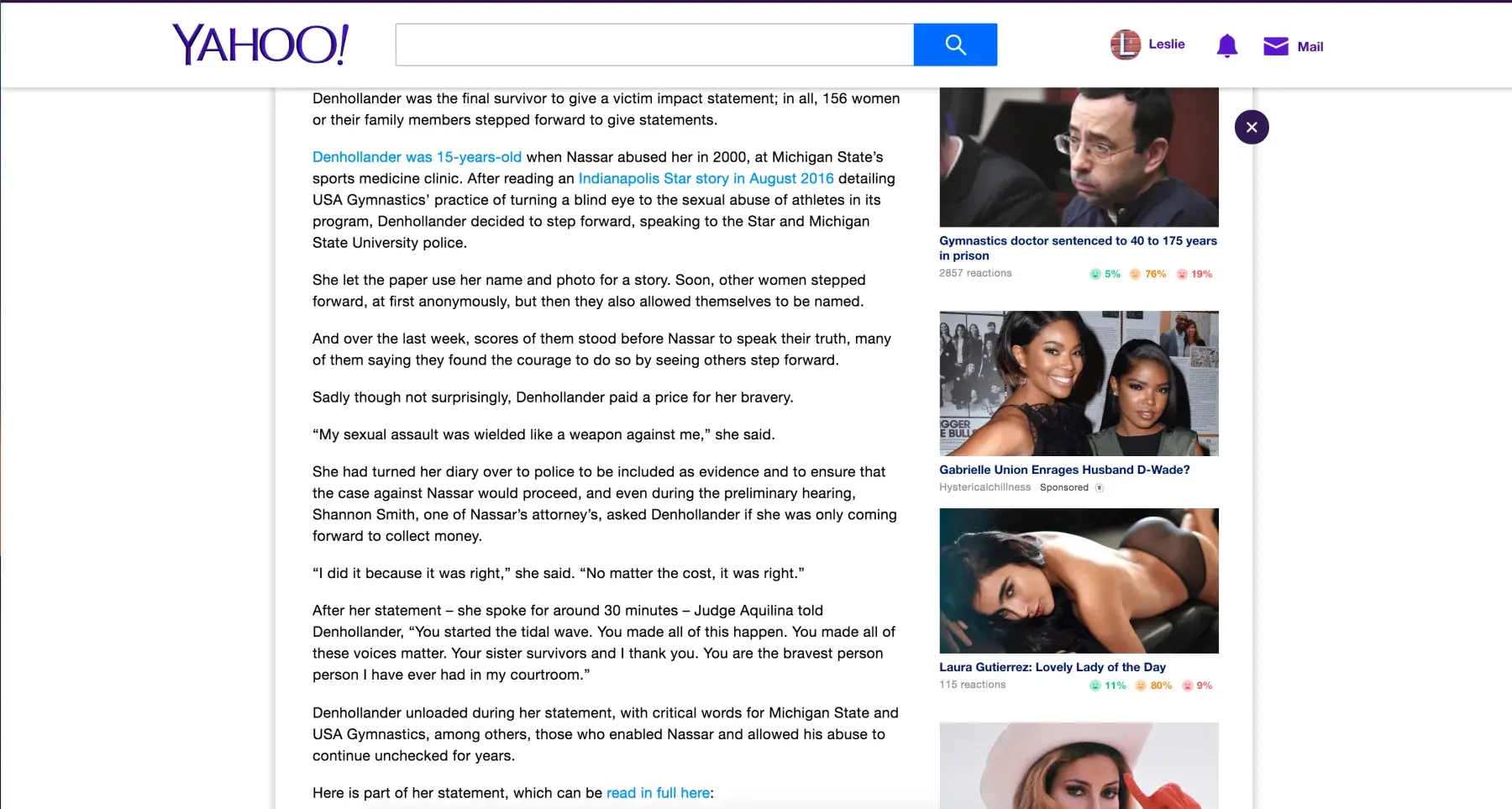 While reading the latest article on Larry Nassar, convicted sexual predator and abuser, on the right hand side of my screen I was shown a photo of a topless "Laura Gutierrez, Lovely Lady of the Day" clad only in her underwear, looking seductively at the camera. A screenshot is attached.