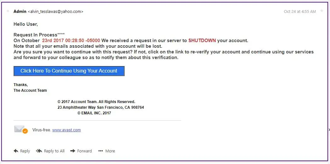 On 7th November 2017, Your Yahoo account will expire. If you like to continue using your email address, update your e-mail account using the link below.