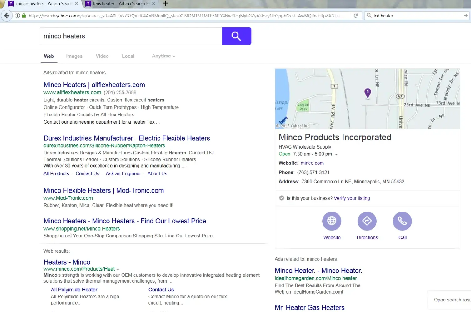 Description: I work at Minco Products and we manufacture specialty heaters. When I search "Minco Heaters, " two ads appear with our company name but link to competitive company websites. One is a direct competitor named "Allflex" and their ad headers says, "Minco Heaters / allflexheaters.com" and links to their website www.allflexheater.com. The other is a shopping network and their ad headline says "Minco Heaters - Minco Heaters - Find Our Lowest Price" and links to www.shopping.net/Minco Heaters." Neither of these companies have permission to use our company name in their ads. Clearly their trying to steal business from us by misrepresenting our company using Yahoo's paid ad program. Please stop them immediately. Allflex has done the same in other browsers which pulled their ads. Please note, there is a third company using our name that comes up in the same search results however, they are an approved Minco Products distributor and have permission to use our company name in their Yahoo paid search program.