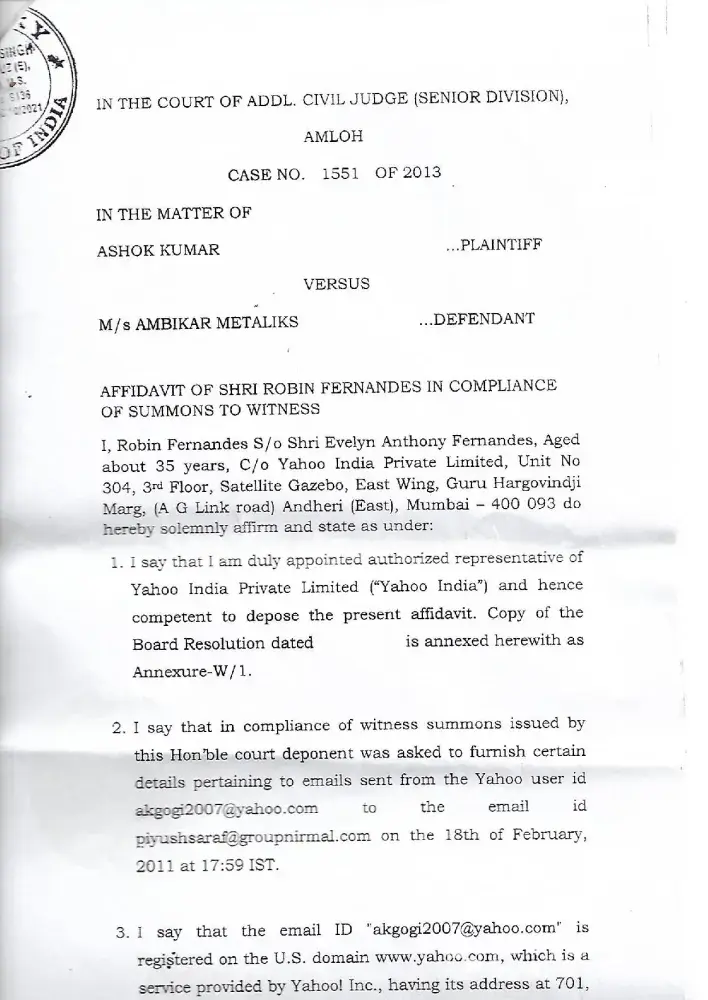 We have asked to yahoo india to just authenticate the mail in the court but they simply submit a affidavit that they are not able to authenticate the mail. I am enclosing the affidavit given by yahoo for your reference.