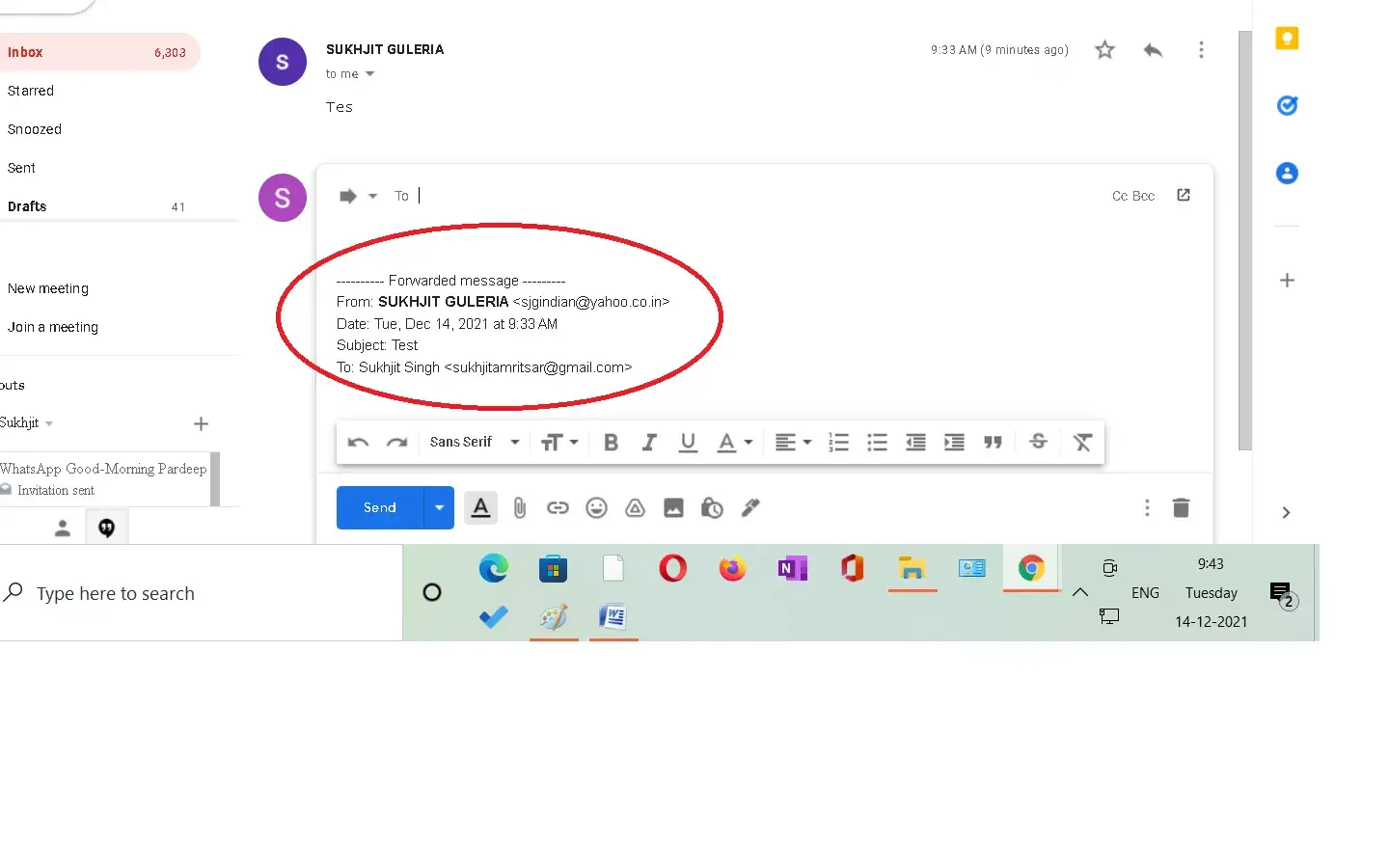 I am enjoying your services for a long period & I am thankful to you for the beautiful services. After a very long period I faced this issue that when I send Email then my account info get change in the Email received by the other person; My name in account is ‘SJ Singh' but when I sent Email to [protected]@gmail.com then shows ‘Sukhjit Guleria'. Both the screen shorts are attached. You are humbly requested to get check & solve the issue. I will be very thankful to you for this kindness.