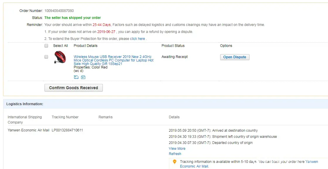 Hello. I ordered a tattoo from aliexpress on 20 of April 2019 and it hasn't moved a bit since I ordered it. In the tracking information it says "Order information received by carrier" since day 21 of April. I want an explanation for this and when will I get myour package? The tracking number is LP00128805507743