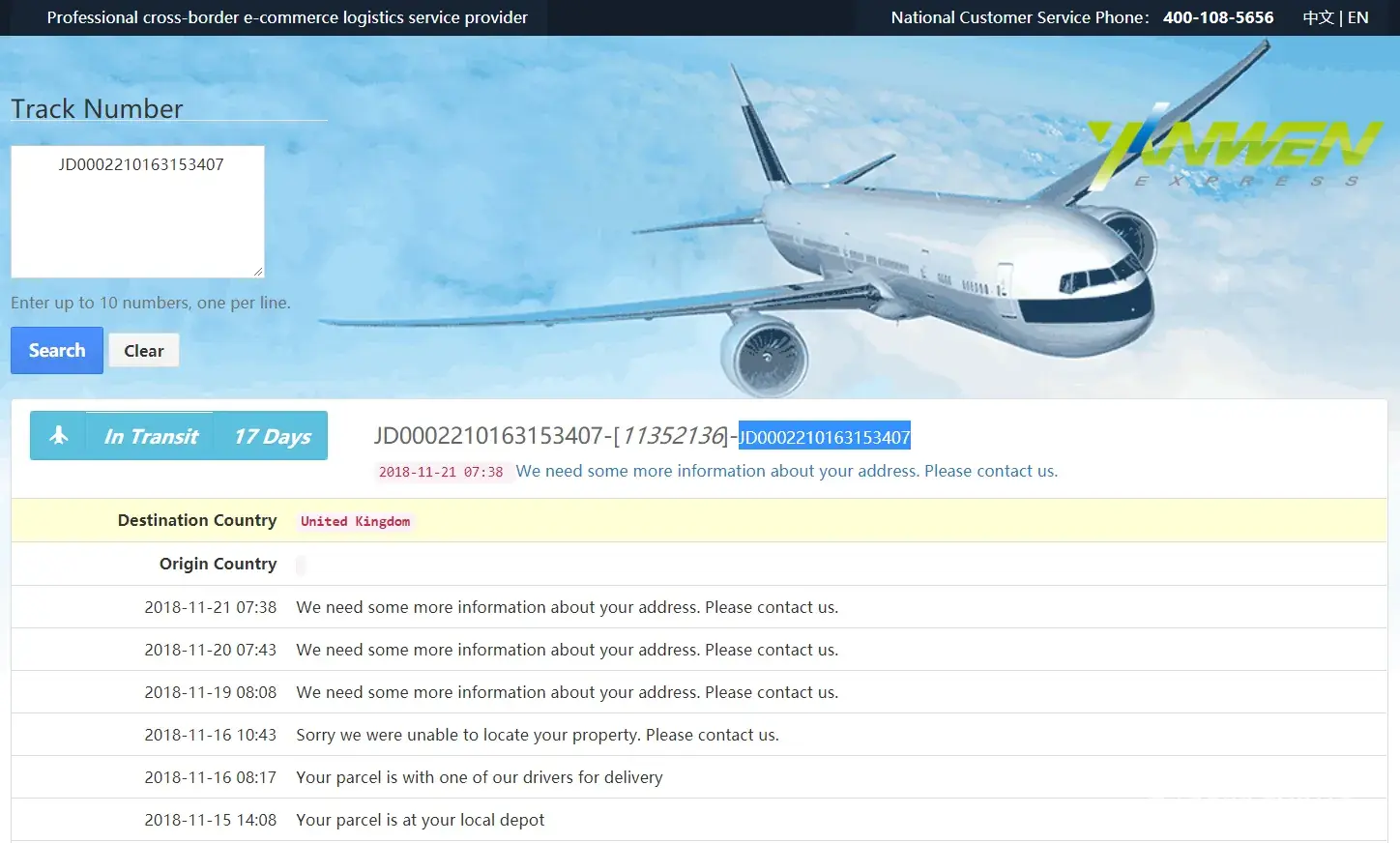 2018-11-21 07:38 We need some more information about your address. Please contact us.
