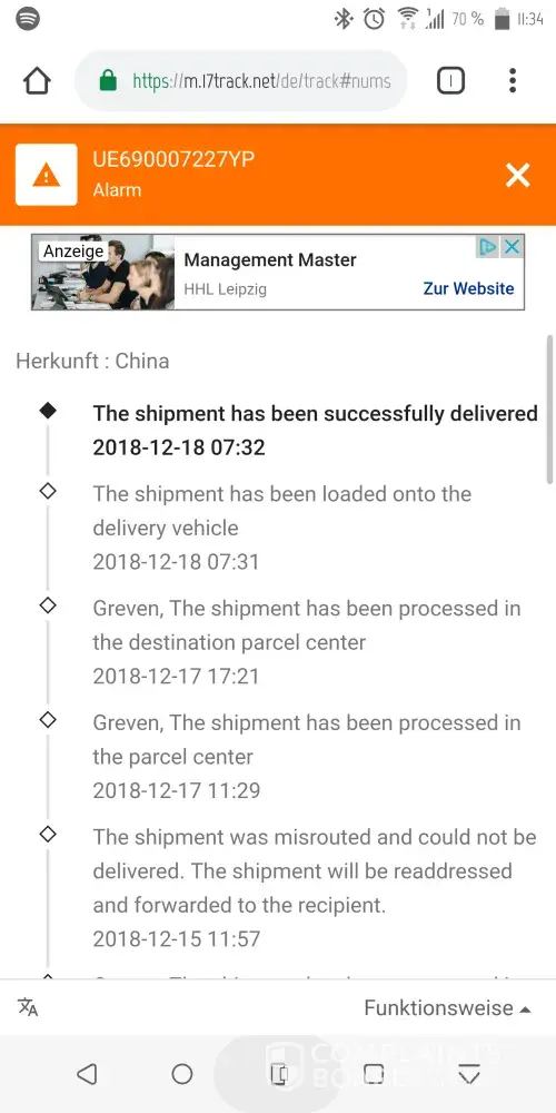 Hey there, the following is my problem with the delivery status and for me, its impossible to understand that the package is loaded onto the delivery vehicle at 7:31 in the morning and is "successfully delivered" at 07:32 in the morning. Especially they did not wirte the housenumber on the package. So my question is, where did they delivered it, cause i was talking do DHL germany again, and they said, they need a tracking number, the tracking number i have UE690007227YP is useless to them.