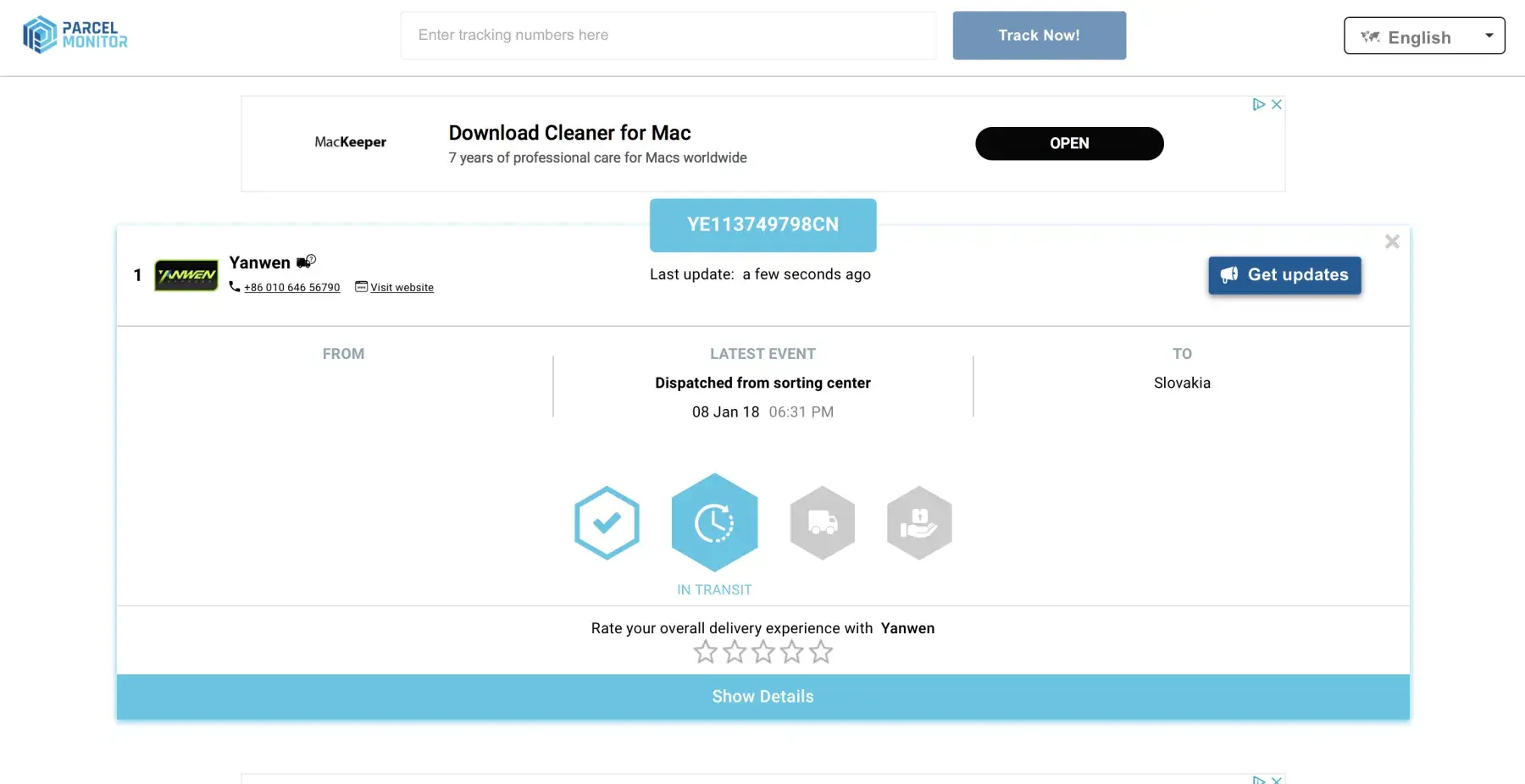 A postal parcel was sent to me via your service on 05 May 2018, 17:33:32 PM, which has the tracking number UC099709124MY.
