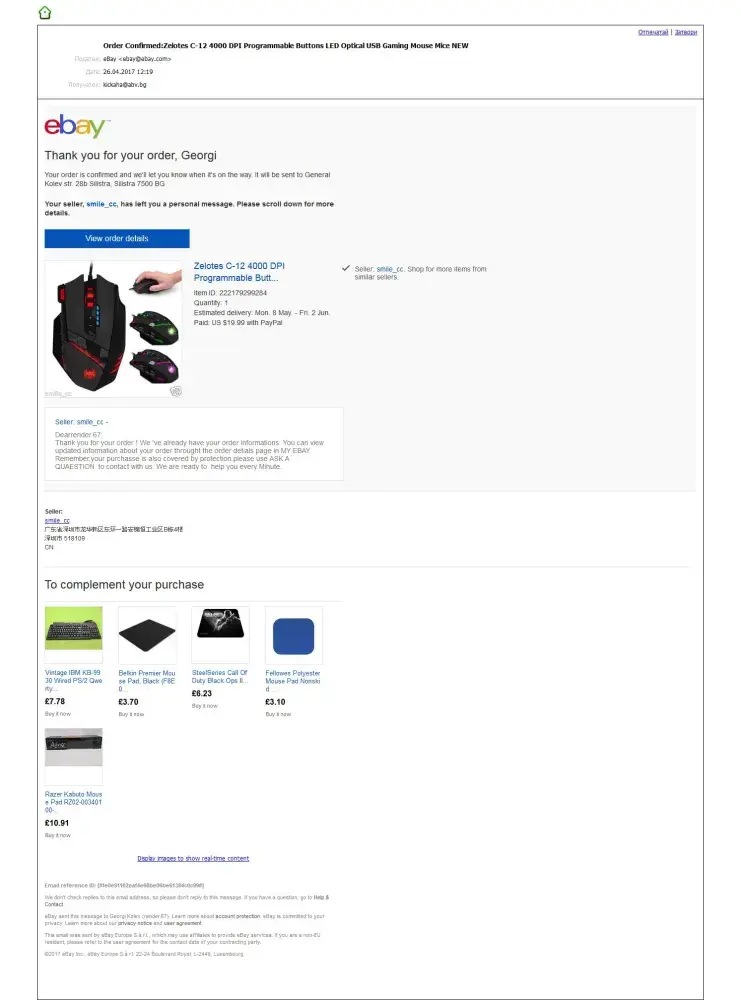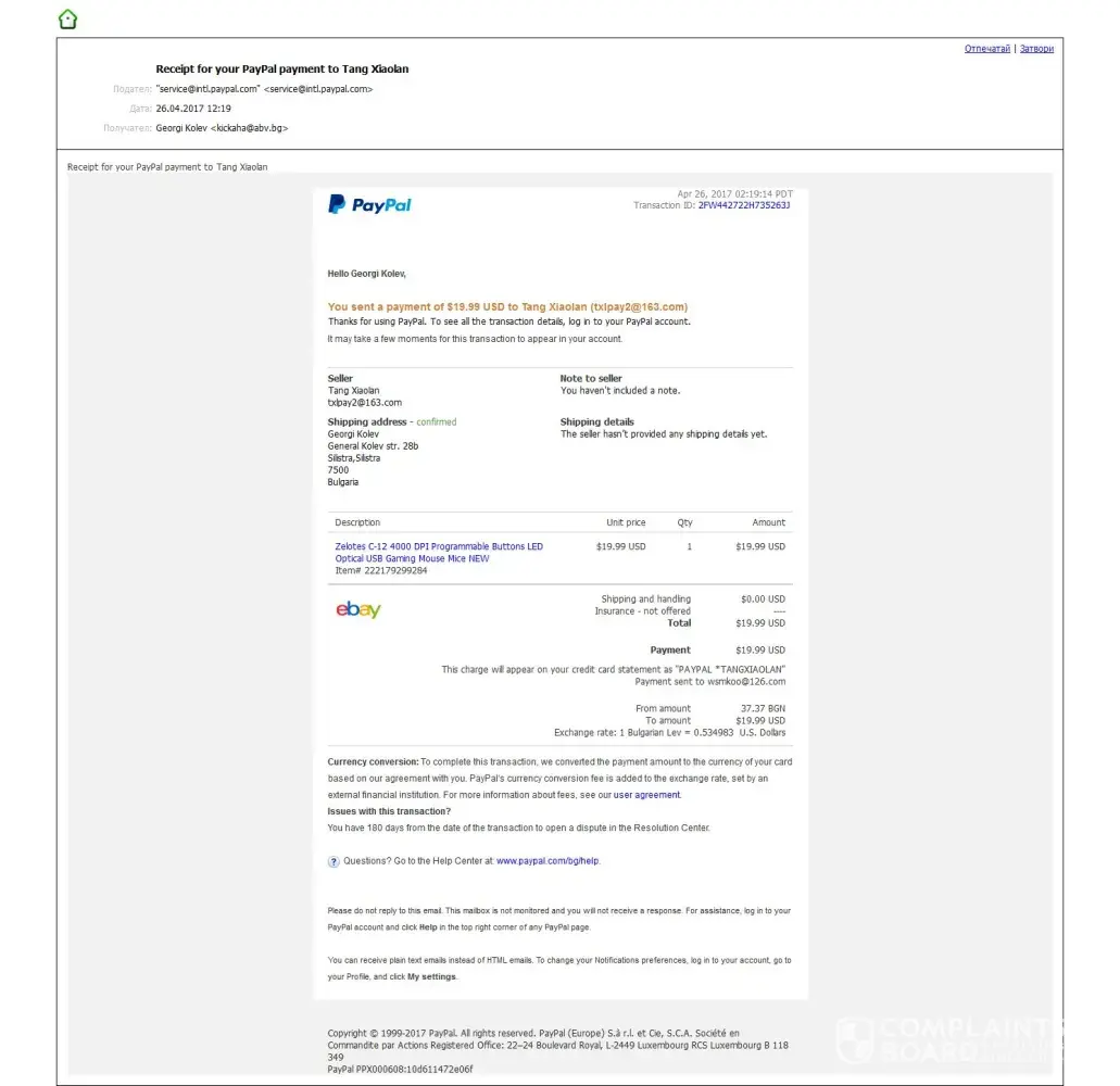 On April 26, 2017 via eBay I purchased a computer mouse for approximately US $ 20. On April 27, a trader notifies me that an item was delivered to a courier and gave me a tracking number AA033864287IN for my purchase. According to the information from Beijing YANWEN Logistics.Co., Ltd, for this tracking number, a shipment was received at the airport in Bulgaria on May 3rd. There is no information at which airport and to whom the goods are handed over. The Bulgarian customs and postal services refuse to receive this item. I like and want this mouse. Unfortunately, so far, I have not received my purchase.