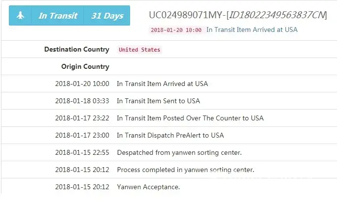 im waiting to for a package from china, sent with yanwen company on january 15, 2018 to usa.. Tracking is uc024989071my and its show [protected]:00 in transit item arrived at usa... I need to know whats going on? where are the email comunications with yanwen company ? because fax didnt work! what kind of shipping company is this?
