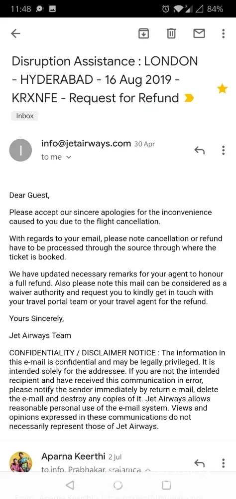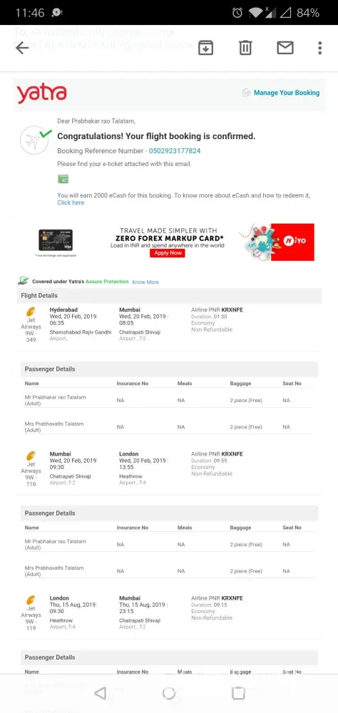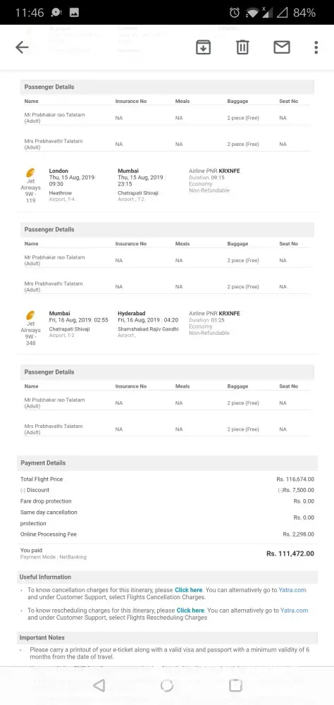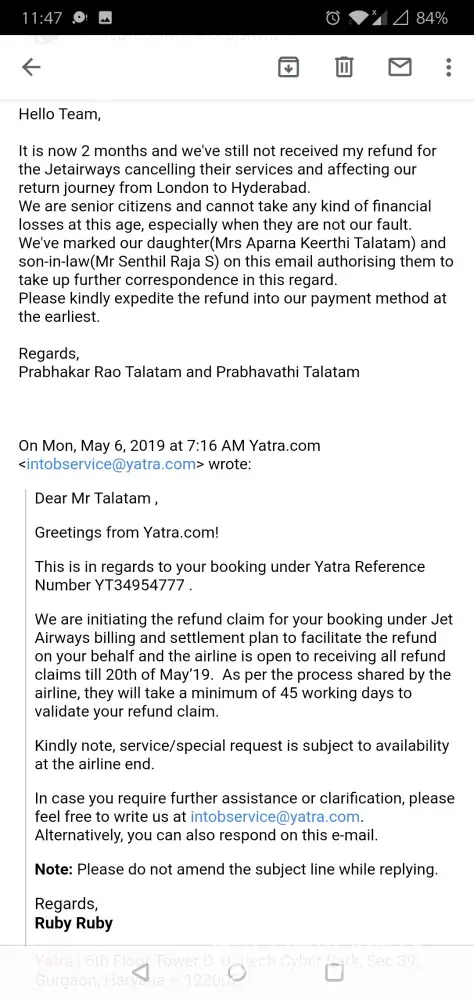 I have not received any support regarding the jet airways cancelled ticket bearing reference no.[protected] booked on February from Hyderabad to London round trip for 2 (myself aged 78years and my wife aged 69years). Jet airways has given necessary comments to yatra regarding full refund but Yatra.com company is not even responding to my follow up email for refund even after 4months and my booking is not shown Ng on their website either. No one picks up call and not a single customer care number is working. I am contemplating legal actions against this gross misconduct against 2 very senior citizens and i have to approach the consumer forum.