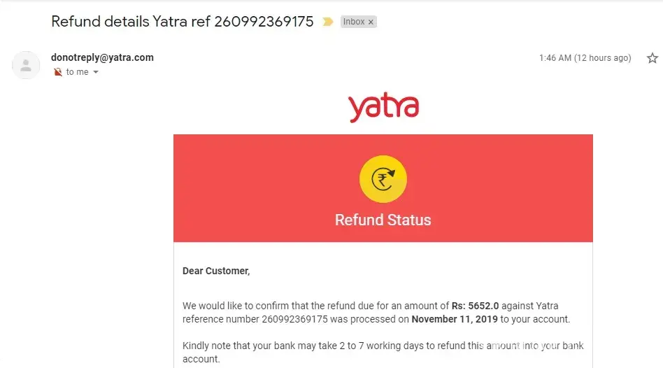 Refund amount from Yatra : INR 5652.00