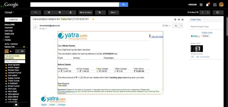 Now the issue is due to change of my schedule and location, I have to cancel the whole booking including Hotel & Flights. So I emailed at [protected]@yatra.com on 31st May 2013 early morning to cancel the whole booking and initiate the refund process as early as possible. But to my surprise there was no reply till evening. So I called the customer care for the same in the evening, but the reply was disgusting. According to them my booking is now non-refundable and non-amendable, so no refund.