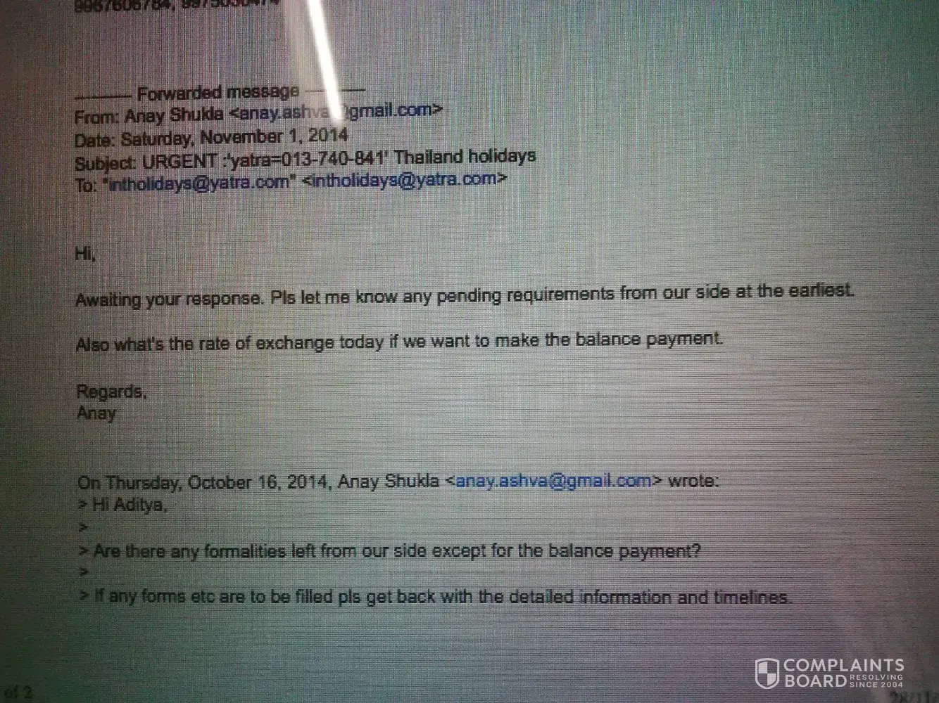 I'd booked my honeymoon trip to Thailand with Yatra on Sept 17, 2014 (Booking Id - S1114786). Since then I've been following up with Yatra personnel (Aditya Koer and Nitin Jha) numerous times for HOTEL VOUCHERS AND EXCHANGE RATE FOR BALANCE PAYMENT but haven't received any response from them. I also wrote for assistance in filling out some forms sent by them but haven't heard from anyone. This, despite telling them that WE NEED HOTEL VOUCHERS FOR VISA APPLICATION. Throughout the booking process our queries were never addressed completely and satisfactorily. We'd to keep calling and writing mails again and again for the same queries but still these people didnt bother to respond.