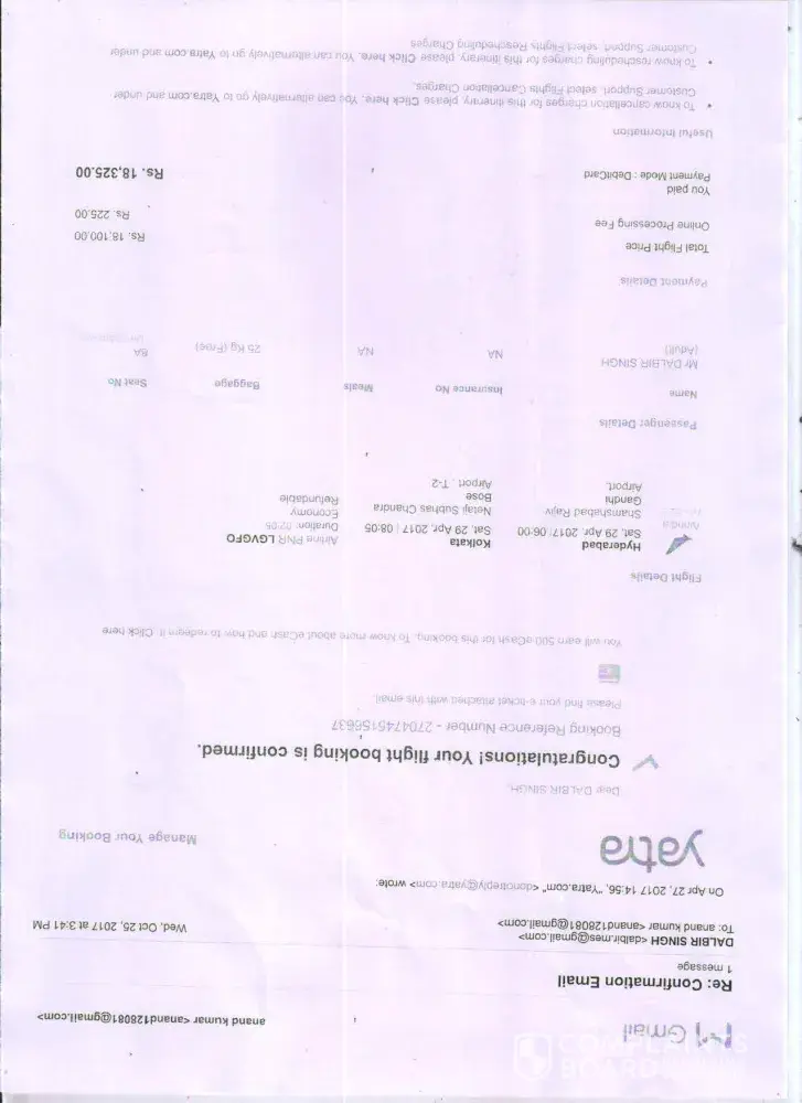 i Mr. Dalbir Singh had booked a flight ticket to Kolkata on 27 April 2017 by Air India Flight No. AI-525 for 29 April 2017 to be departed @ 06:00 hours with BOOKING REFERENCE NO. [protected]. Later, due to unavoidable circumstances I had to cancel my ticket on 28 April 2017 @ 13:16 hours. But till date i.e., 25 Oct 2017, the amount for the cancelled ticket has not been refunded. The reasons are best known to you for the delay in refunding the amount. If the amount for the cancelled ticket is not refunded within 07 days from today with penal interest, I am forced to take legal recourse againt yatra.com and also approach press and other electronic media to complain for the inappropriate delay in refunding the amount. Awaitng a positive reply with in the stipulated time please. The photo copies of BOOKING and CANCELLATION print outs are enclosed here with.