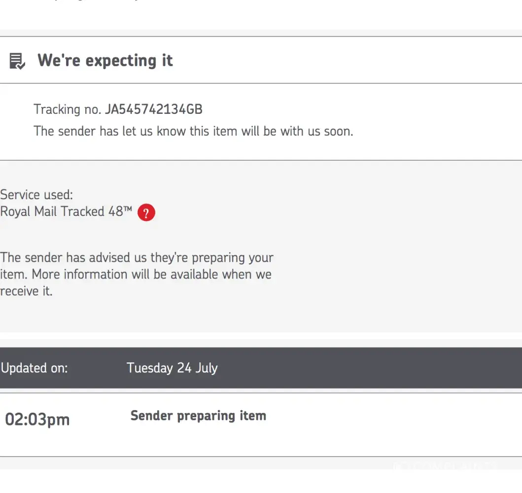 2. I didn't get tracking (Royal Mail) until 24th saying 'Service used: