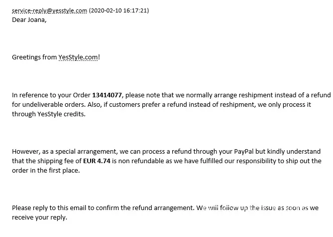 Now YesStyle is asking me to pay the double the shipping fee: reimbursement for the first shipping (even if shipping was free in the initial order) and another one for the re-shipping of goods. What a joke! Why do I have to pay for Royal Mail faults?!