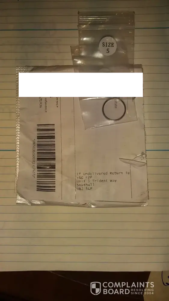 I ordered some sun glasses and some foundation from WISH 7 weeks ago, today I got a cheap tat looking wedding ring in a box, no idea if they have sent this instead of my sunglasses and foundation but I definitely didnt order this cheap ring. As above mine has return address as Y&G F2P Southall... Has anyone managed to get hold of anyone to actually speak to about this ?
