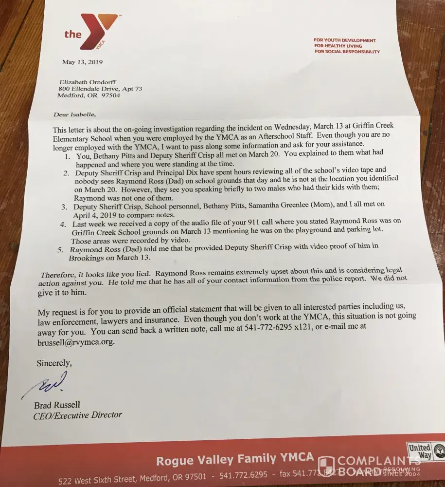 May 31, 2019 To whom it may concern, On May 29, 2019 I was hand delivered a letter by brad russell the ceo/executive director of the Medford YMCA. He came to my current place of employment. He came with no name tag (unidentifiable) and stated to read the letter and then call him. He was very unprofessional to my employer and co-workers. I read thi...